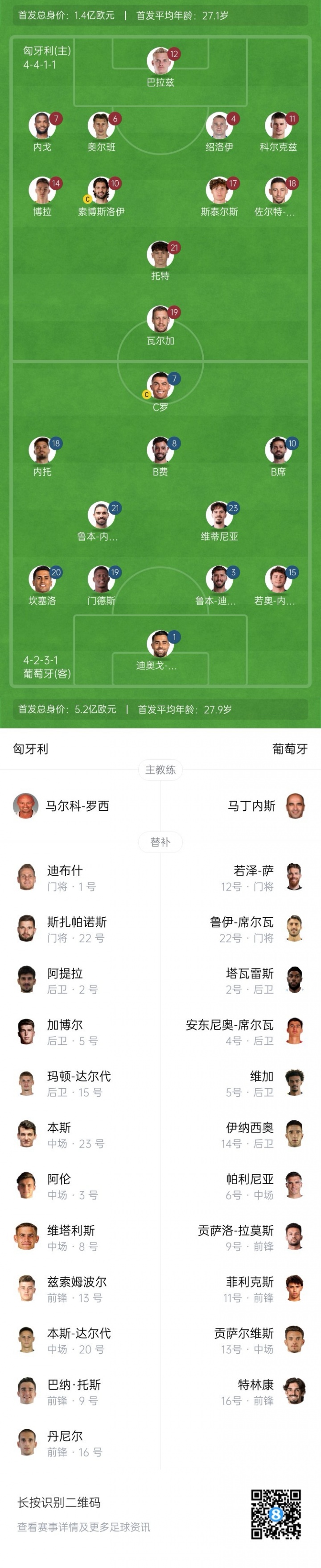 9月10日讯 世欧预F组,匈牙利主场迎战葡萄牙比赛即将打响。赛前首发出炉。